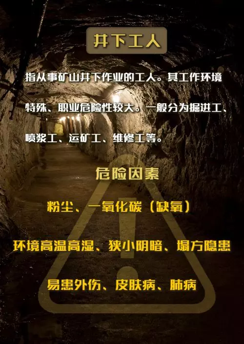 當然,還有我們所熟知的煤礦工人。他們工作在地底平均200米的地方,沒有陽光,沒有新鮮空氣,陰暗潮濕,面臨著矽肺、風濕等各種疾病,以及瓦斯爆炸、頂板冒落等各種危險。