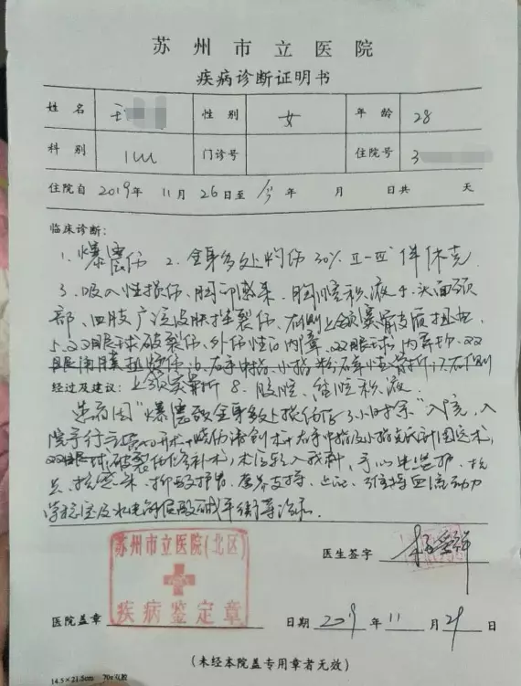 事故發生後,傷者被送往醫院。根據王先生提供的蘇州市立醫院開具的疾病診斷證明書顯示,王先生的媽媽、二姐以及二姐的未婚夫均為爆震傷或爆炸傷,3人身上燒傷、灼傷面積為20%至30%,且均全身多處受傷。
