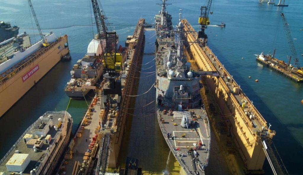 BAE系統公司近日在社交網路上發佈視頻,展示了其下屬的聖迭戈船舶修理公司使用浮動船塢,一次將兩艘美國海軍阿利伯克級驅逐艦托舉出水進行干船塢維護的壯觀畫面。