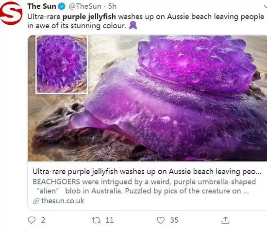 一隻罕見的紫色水母被衝到澳大利亞城市拜倫灣的海灘上,在社交網站上引髮網友熱烈討論。有網友將紫色水母戲稱為「外星人」,有網友稱其是「生物多樣性的美麗結果」,也有網友質疑水母的紫色或與化學物質有關。