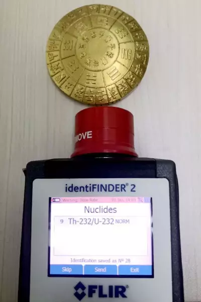 經海關關員現場測量,該「能量石」核輻射值為112.4µSv/hr,核素為Th-232/U-232,超標112倍!β值為6.79Bq/cm2,放射性超標。