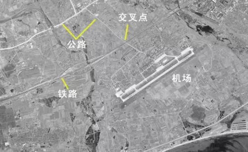 山海關機場衛星圖片。進機場的公路要經過一個鐵路交叉點。