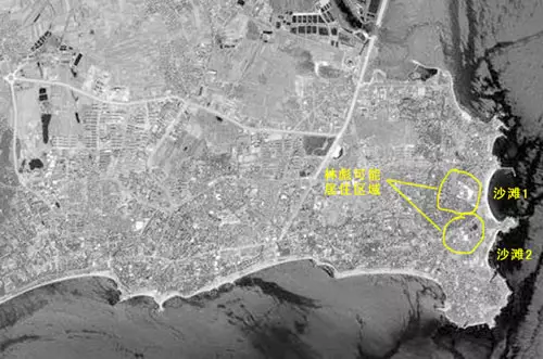 北戴河衛星圖片。推測當年林彪可能的住處。兩個區域都有極佳的游泳沙灘近在眼前。中間好似有個小山,符合描述913事件中「山上、山下」的說法。