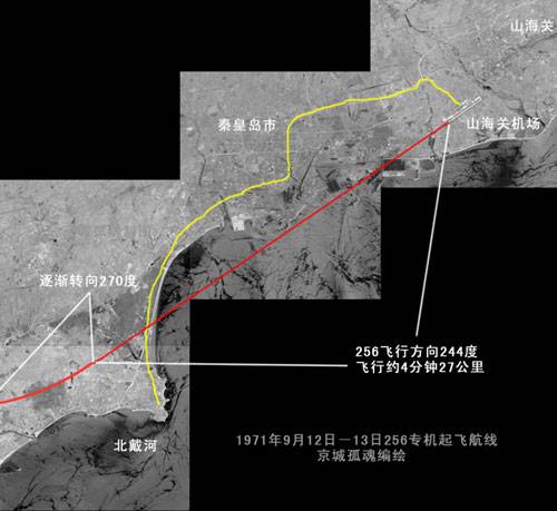 256起飛以後,航向先順著山海關機場跑道方向(244度)向西南飛行了4分鐘,來到山海關西南40公里,林彪剛剛離開的北戴河上空(林立衡、張寧都聽到了飛機聲音),然後緩慢異常地轉了一個大的出奇的弧度向西北(310度)飛去。