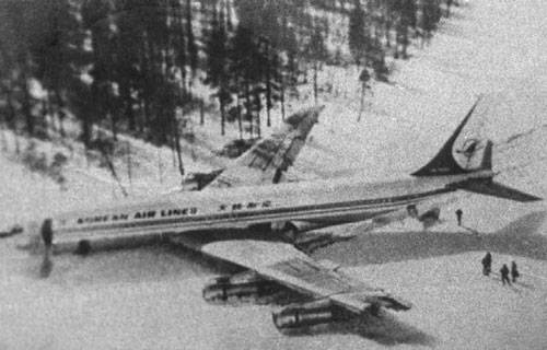 1978年4月20日,在蘇聯境內科爾皮亞爾維湖的冰面上迫降的韓國航空公司波音707客機。注意其左機翼被導彈打掉一截,在這種情況下居然又飛了一個多小時。