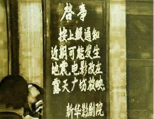 海城一電影院門口懸掛地震預報通知
