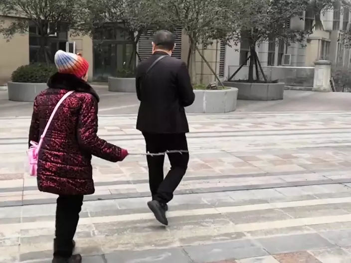 兩母子現出門,杜男都讓母親拿着木條在後面趕他,覺得這樣可幫助喚起母親打自己的記憶。(網上圖片)