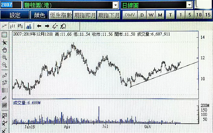 其中一隻可以留意一下的是碧桂園(2007)。碧桂園今年8月左右見到9.49元的年內第二低位,之後沿著一條上升軌緩慢向上爬升,周四收11.62元,按這個走勢,假設中美貿易談判首階段可達協議的話,應該可以繼續反覆炒上,直至到明年2、3月。碧桂園的上升軌有其基本因素支持。