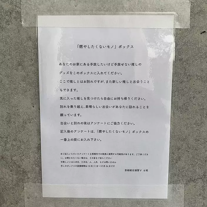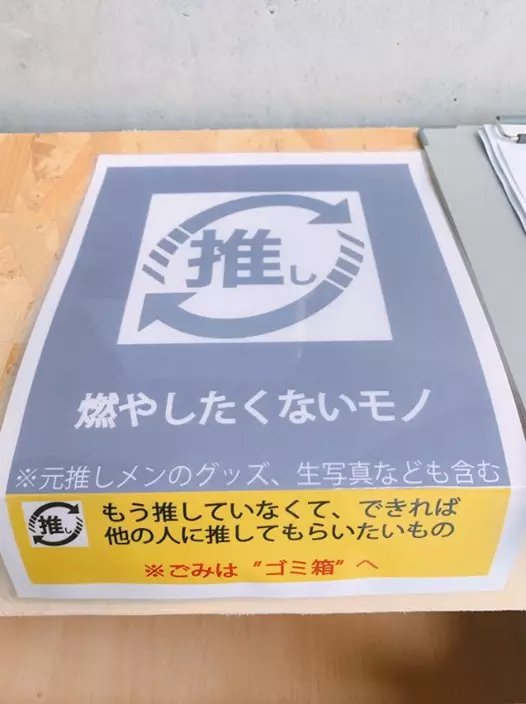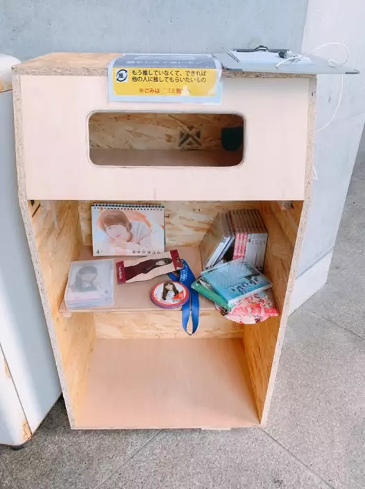 為了解決這個難題,日本京都造型藝術大學設置了一個「元推し回收箱」。然而,該回收箱上貼有的標識並不是一般回收桶上的「紙」,而是貼上了「推し(喜歡的偶像/角色)」,並寫有「不想燒的東西」、「內含原本命的周邊和照片」、「我已經出坑了,希望還在坑裡的同好們能好好愛他」。