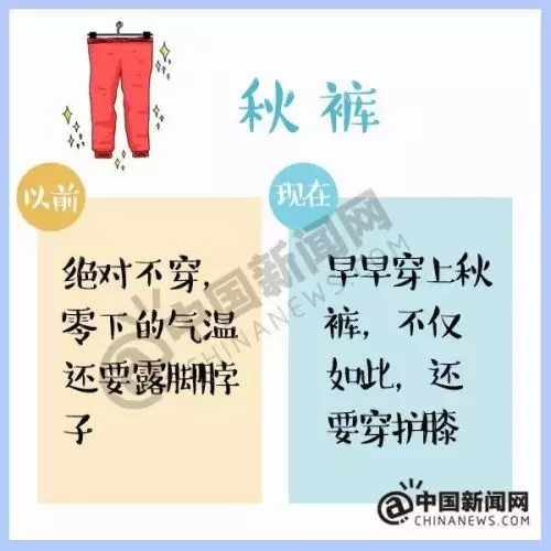 現在,在冷空氣來之前就早早將秋褲準備好,不僅會在冬天來的時候穿上秋褲,還要把秋褲塞進襪子裏,秋衣塞進秋褲里,順便再穿上護膝。「秋褲真香」!
