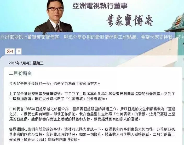 亞視執行董事葉家寶在網誌撰文表示,如果一切順利,周四幾筆款項進帳,周五可以向所有亞視員工發放2月份薪金。