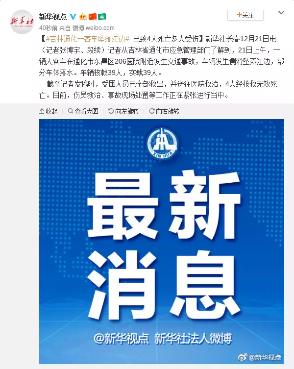 記者從吉林省通化市應急管理部門了解到,21日上午,一輛大客車在通化市東昌區206醫院附近發生交通事故,車輛發生側滑墜落江邊,部分車體落水。車輛核載39人,實載39人。 截至記者發稿時,受困人員已全部救出,並送往醫院救治,4人經搶救無效死亡。目前,傷員救治、事故現場處置等工作正在緊張進行當中。