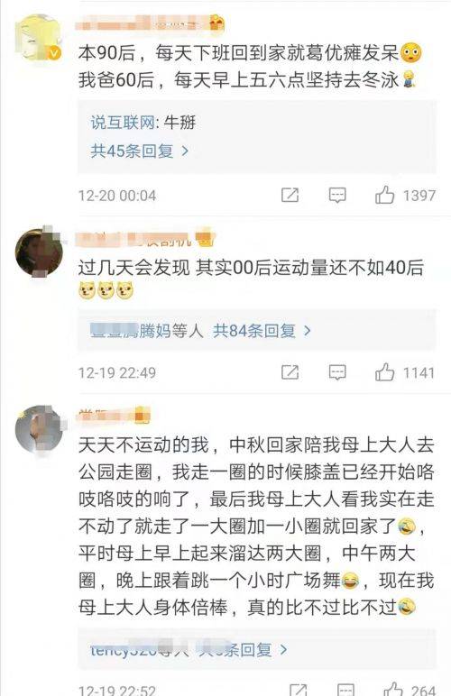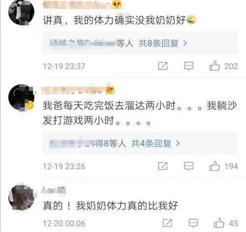 這樣的結論引起了90後網友的共鳴,大家紛紛表示:「我的運動量確實比不上我爸媽」,「你大爺永遠是你大爺」。