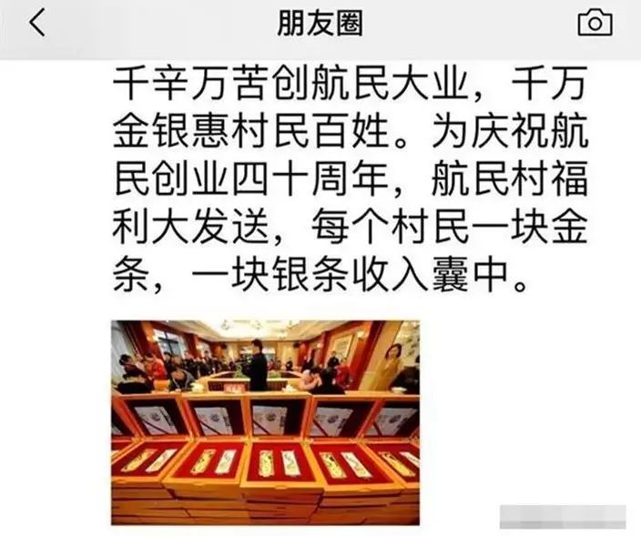 據了解,本月19日,在內地上市的航民集團向村民發送金條和銀條,只要村民是航民村戶口,都可以獲得。事件在微信朋友圈走紅,有村民發文指,「為慶祝航民創業四十週年,航民村福利大寄送,每個村民一塊金條,一塊銀條收入囊中。千辛萬苦創航民大業,千萬金銀惠村民百姓。」