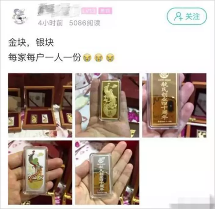 航民村向村民發送金條和銀條。(網上圖片)