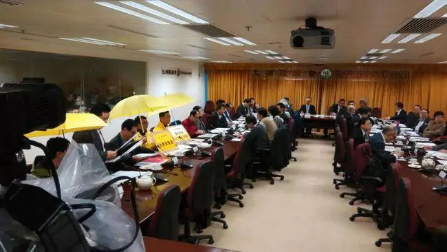 會議開始前,有民主黨及新民主同盟代表舉起黃傘,抗議政府假諮詢。