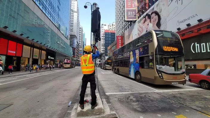 工人在修理被破壞的交通燈。