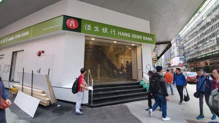 恒生銀行亦有工人圍起木板。