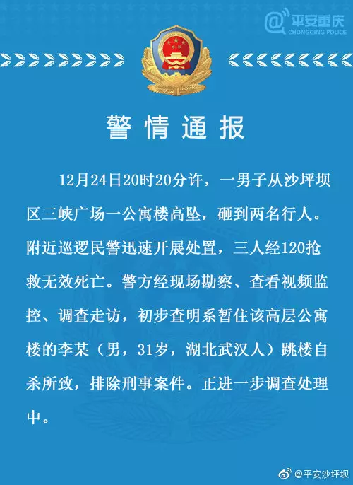 最新進展:12月24日20時20分許,一男子從沙坪壩區三峽廣場一公寓樓高墜,砸到兩名行人。附近巡邏民警迅速開展處置,三人經120搶救無效死亡。警方經現場勘察、査看視頻監控、調查走訪,初步查明系暫住該高層公寓樓的李某(男,31歲,湖北武漢人)跳樓自殺所致,排除刑事案件。正進一步調查處理中。
