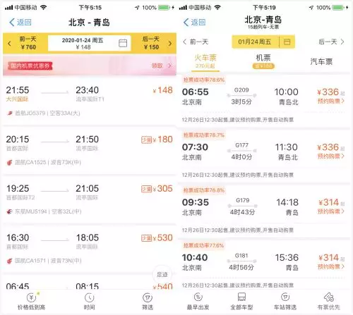 北京-青島高鐵二等座價格區間為314-336元,首航JD5379航班經濟艙機票價格為148元,比高鐵二等座價格便宜一半還多;國航CA1525航班經濟艙機票價格為180元,比高鐵二等座價格便宜近五成。