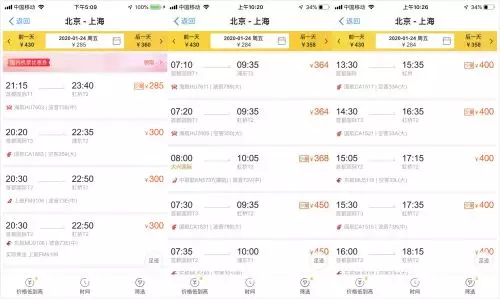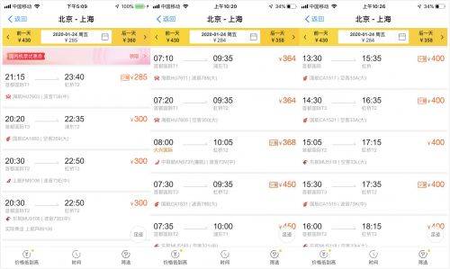 除夕(1月24日)當天,鐵路「12306」APP顯示,北京-上海高鐵二等座價格區間為553-558元,中新經緯客戶端通過第三方售票平台發現,北京—上海多架航班機票經濟艙價格在300-400元,其中,海航HU7603航班機票經濟艙價格僅285元,比553元的二等座高鐵票便宜近一半。