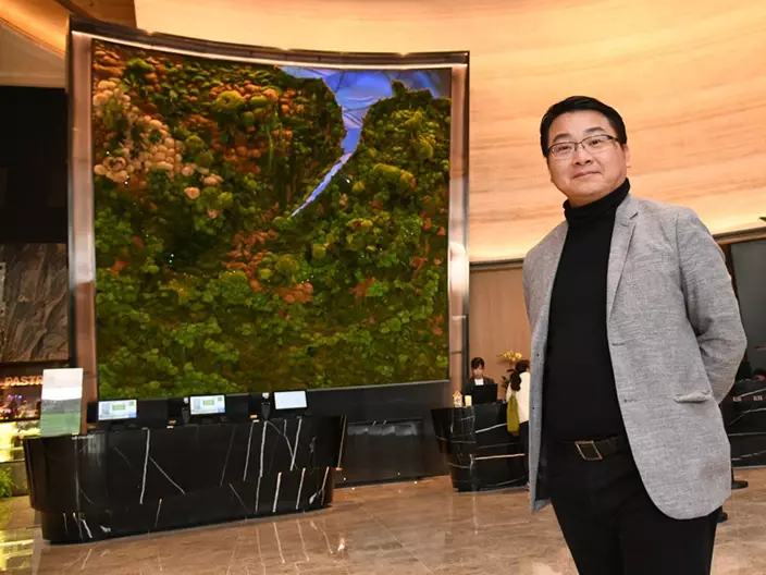 黃展強指,帝逸酒店大堂的苔蘚牆描繪了沙田俯瞰圖。
