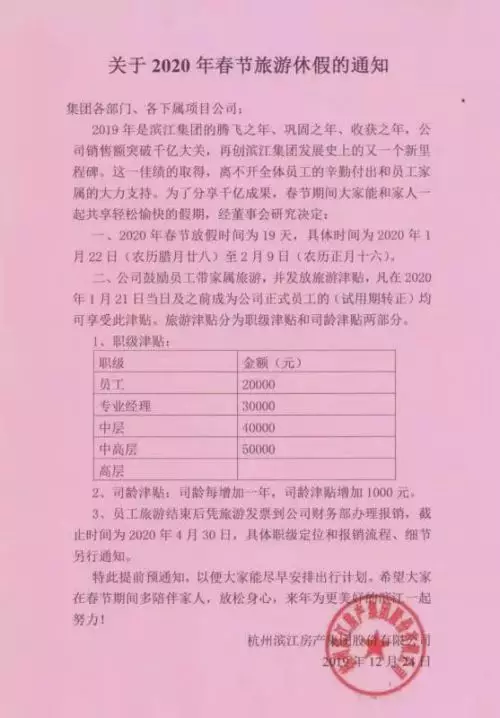 在網友曬出的這份濱江集團企業內部通知上,揚子晚報/紫牛新聞記者注意到有這樣的表述:2019年是濱江集團的騰飛之年、鞏固之年、收穫之年,公司銷售額突破千億大關……為分享千億成果,春節期間大家能和家人一起共享輕鬆愉快的假期,經董事會研究決定:一、2020年春節放假時間為19天,具體時間為2020年1月22日(農曆臘月廿八))至2月9日(農曆正月十六)。二、公司鼓勵員工帶家屬旅遊,並發放旅遊津貼。凡在2020年1月21日當日及之前成為公司正式員工(試用期轉正)均可享受此津貼。旅遊津貼分職級津貼和司齡津貼兩部分,從普通員工到中高層管理人員的職級津貼最低2萬,最高5萬。司齡每增加一年,司齡津貼增加1000元。對此有網友笑曰:不羨鴛鴦不羨仙,只羨別人曬津貼。
