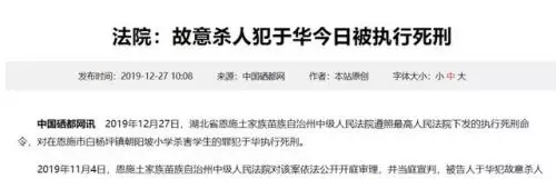 12月27日,湖北省恩施土家族苗族自治州中級人民法院遵照最高人民法院下發的執行死刑命令,對在恩施市白楊坪鎮朝陽坡小學殺害學生的罪犯於華執行死刑。