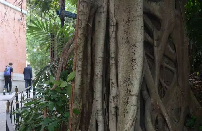 昨晨七時三十五分,五十七歲姓何保安發現終院正門入口兩條圓形石柱,被人用黑油噴上「霸道司法、依(以)權謀私」等字句,相距終院五米的大榕樹,樹身亦遭黑色箱頭筆寫着「香港司法不公平、依(以)權謀私」,於是報警。法院職員其後用兩張大紙遮蓋塗鴉部分。