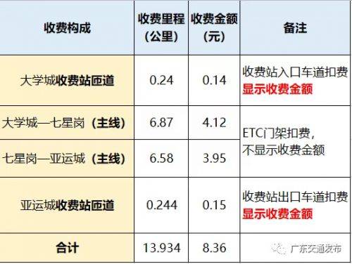 比如車主張先生駕駛ETC小客車行駛廣州南沙港快速路,從大學城收費站駛入,亞運城收費站駛出,則其收費構成為:大學城收費站匝道費用(0.240公里,0.14元)、大學城—亞運城主線費用(13.450公里,8.07元)、亞運城收費站匝道費用(0.244公里,0.15元),全程合計13.934公里共收費8.36元。