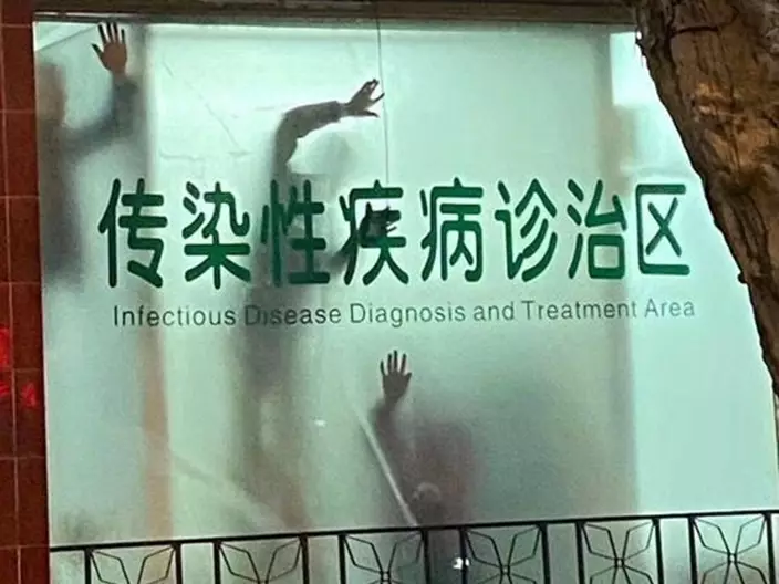網上流傳某地的傳染性疾病診治區有人影拍玻璃。網圖