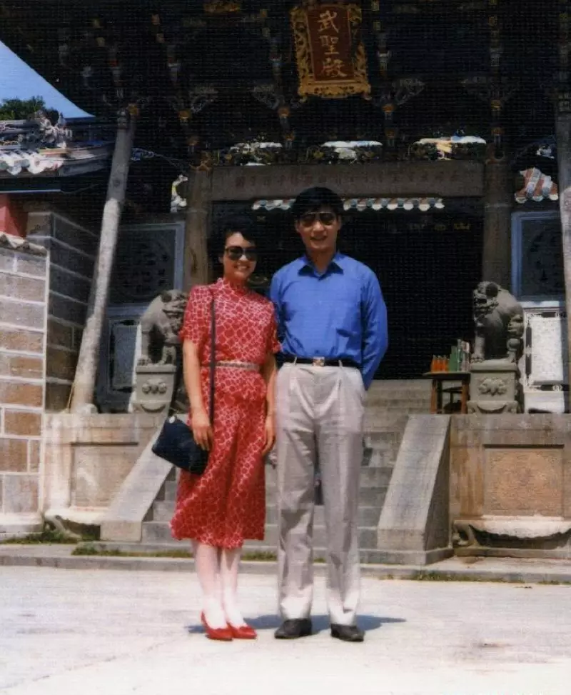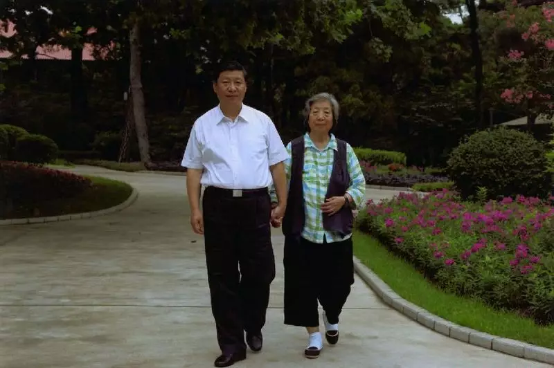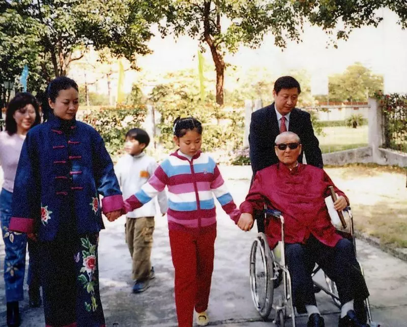 習近平推著在輪椅上的父親習仲勛,女兒習明澤與太太彭麗媛