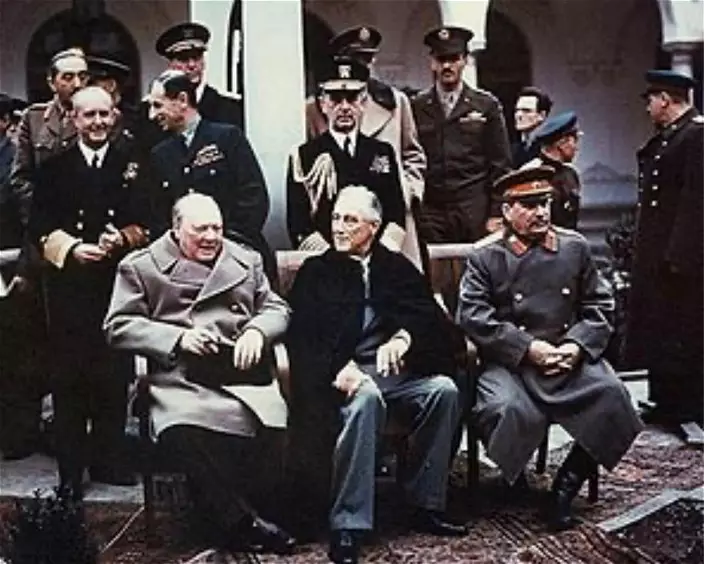 在雅爾塔會議期間,美國總統羅斯福(中)、英國首相丘吉爾(左)和蘇聯人民委員會主席史太林(右)拍下的歷史照片。