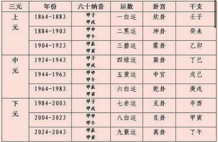 我們現身處的三元九運,起於1864年,終於2043年。看中國的運程,在對上一個三元九運末段,明顯交上惡運,1840年發生了中英「鴉片戰爭」,開始了連場敗仗之始。至於西方交好運,而中國行衰運的關鍵,是在於英國人瓦特在1776年發明了蒸汽機,帶出西方的工業革命,在生產力和軍事能力方面都能快速提升,科技興國,迅速地由農業社會變成以製造業為主的社會。而中國還停留在落後的農業社會階段,閉關鎖國,對外界飛躍發展懵然不知,最終被西方列強侵略,搞得國貧民弱。