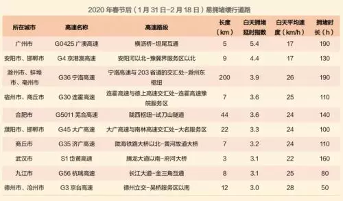 春節後,預計全國高速擁堵路段主要是:G0425廣澳高速廣州段(橫瀝橋-坦尾互通),其次是G4京港澳高速安陽、邯鄲段(安陽河以北-豫冀界服務區以北),兩條高速平均車速均17km/h左右,以及G36寧洛高速滁州、蚌埠、亳州段 (寧洛高速與203省道的交匯處-滁州東樞紐),平均車速 26km/h。