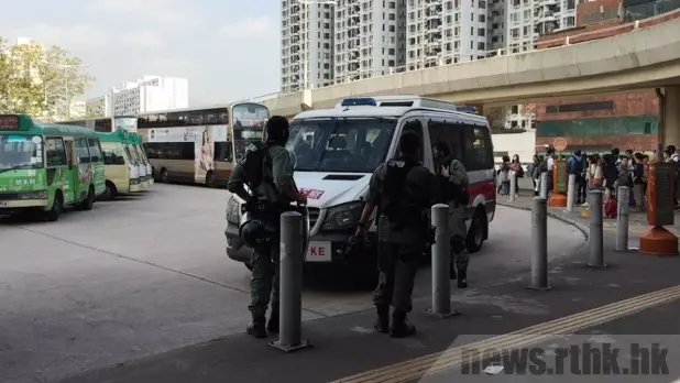 在商場外,下午有幾輛警車駛至,有蒙面防暴警員,持盾牌戒備,商場的多個樓層圍欄位置,早前已把玻璃換成鐵罩,部分高過人的半身。