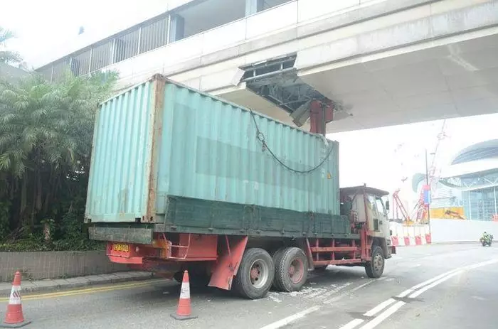 灣仔一輛中型吊臂貨車撞毀行人天橋底部,無人受傷。