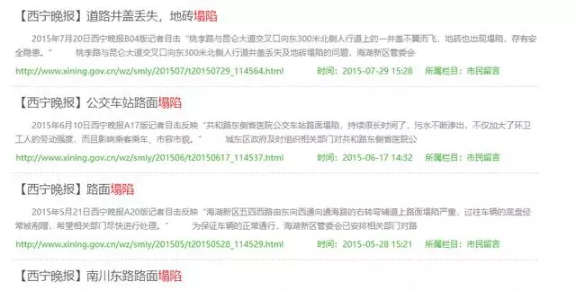南都記者注意到,西寧市人民政府官網的市民留言欄目中披露了多起被當地媒體曝光的塌陷事件。經統計,2014年6月到2016年5月,不到兩年的時間裡,西寧市各區有至少10起塌陷事件被曝光,相關部門對曝光的問題均進行反饋。
