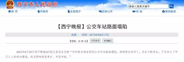 2015年6月10日,西寧晚報記者目擊反映「共和路東側省醫院公交車站路面塌陷,持續很長時間了,污水不斷滲出,不僅加大了環衛工人的勞動強度,而且影響乘客乘車、市容市貌。」 對此,西寧市城東區政府於2015年6月17日回應稱,及時組織相關部門對共和路東側省醫院公交車站有一水井井周下沉,路面積水的問題進行了修復整改,現已整改完畢。