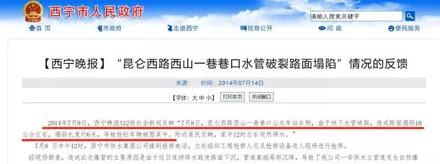 2014年7月9日,西寧晚報社會新聞反映「7月8日,崑崙西路西山一巷巷口公交車站右側,由於地下水管破裂,造成路面塌陷10公分左右,塌陷長度約6米,導致搶險車輛被困其中。附近居民反映,家中12時左右突然停水。」對此,西寧市供水集團公司於2014年7月14日回應稱,經現場勘查,造成此次爆管的主要原因是由於近日連續降水致使路面下沉,管道基礎局部沉降,導致了該公司一條供水主管道發生自然爆裂。「經過45個小時的連續工作,於7月10日早9點完成修復工作並通水。」