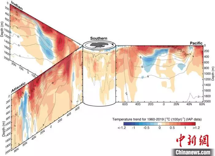 自1960年到2019年,全球四大洋中,不同緯度帶上的0-2000米溫度變化趨勢(單位:攝氏度/百年)。紅色為變暖、藍色為變冷。灰色線為氣候平均態溫度(單位:攝氏度)。 中科院大氣所/供圖