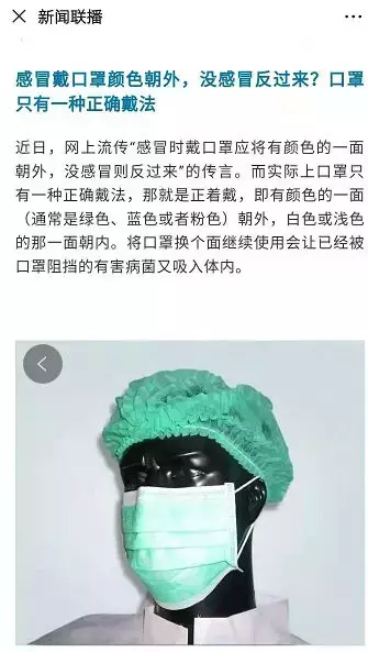 近日,網上流傳「感冒時應將有顏色的一面朝外,沒感冒則反過來」的傳言。而實際上口罩只有一種正確戴法,即有顏色的一面朝外,白色或淺色的那一面朝內。