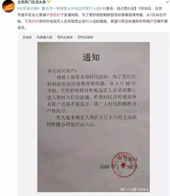 平西府村村委會工作人員曾向媒體證實過決策的真實性:「不僅回湖北的,從任何地方返京的所有租客都不能進村。整個昌平區北七家鎮都下發了相關通知。」