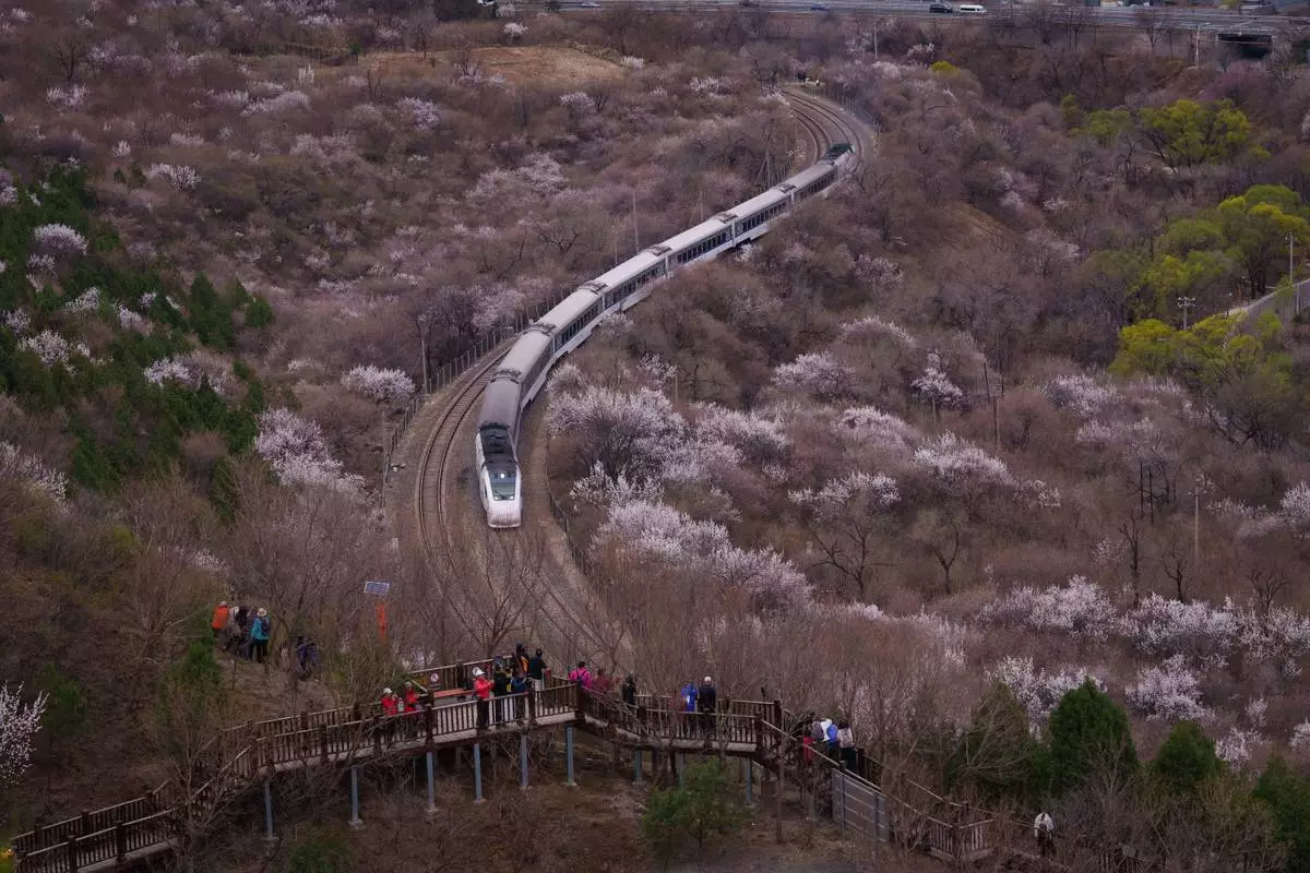 2026年3月30日周一,一列中國高鐵駛過北京居庸關長城(Juyongguan Great Wall)外的盛開桃花旁。(美聯社圖片/Vincent Thian) AP圖片