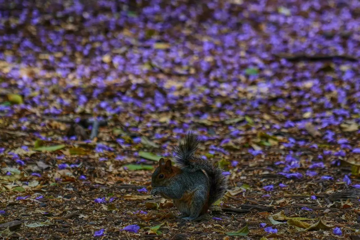 2026年3月31日周二,一隻松鼠在墨西哥城查普爾特佩克公園(Chapultepec Park)內,以一片藍花楹花海為背景享用種子。(美聯社圖片/Marco Ugarte) AP圖片