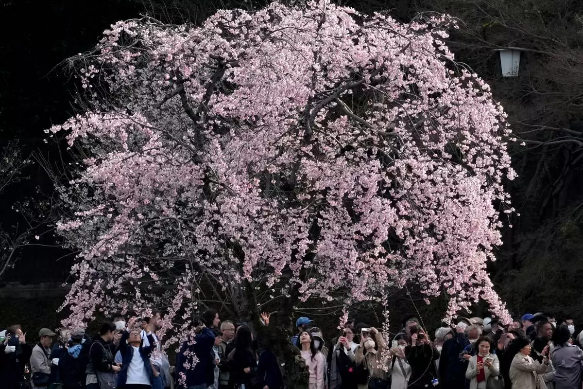 2026年3月27日周五,人們在東京皇居(Imperial Palace)的花園內觀賞盛開的櫻花。(美聯社圖片/Shuji Kajiyama) AP圖片