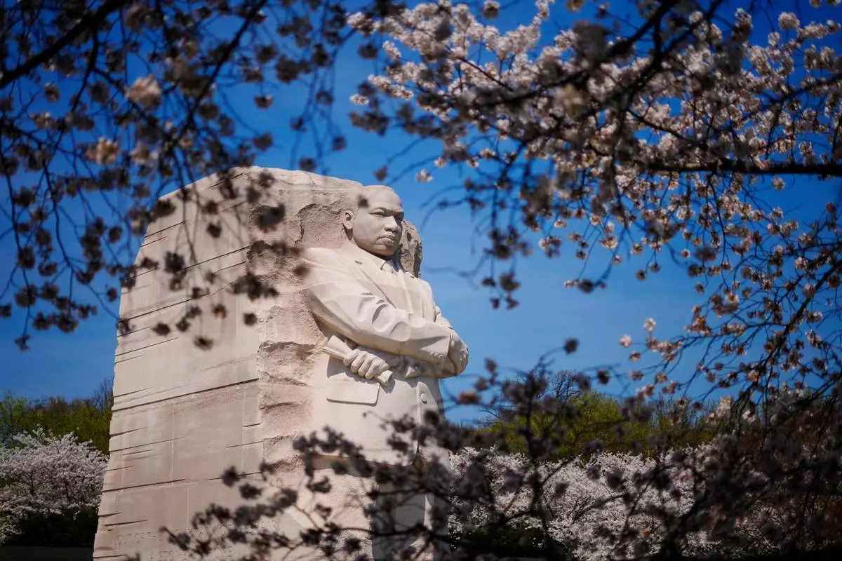 2026年3月26日周四,華盛頓國家廣場潮汐湖畔的櫻花樹叢中可見馬丁路德金紀念碑。(美聯社圖片/Pablo Martinez Monsivais) AP圖片
