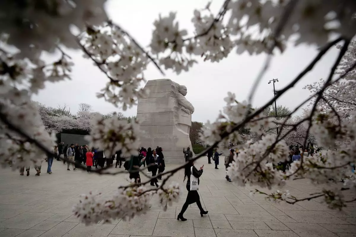 2026年3月27日周五,華盛頓的馬丁路德金紀念碑(Martin Luther King Jr. Memorial)被櫻花環繞。(美聯社圖片/Rahmat Gul) AP圖片