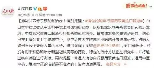 特別提醒:按照世界衛生組織 ,到目前為止,還沒有用於預防和治療新型冠狀病毒的藥物。特定的治療方法正在研究中,並將通過臨床試驗進行測試。再次提醒:普通人請勿自行服用雙黃連口服液,運用中醫中藥,脫離辨證論治都是不準確的!治病請遵醫囑。