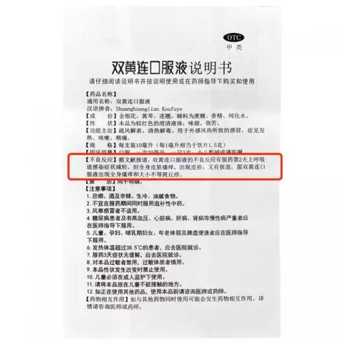 雙黃連口服液的藥品說明書記載:「不良反應」主要是皮膚瘙癢、皮疹等過敏反應,或者是噁心、嘔吐、腹痛、腹瀉等輕微胃腸道反應。